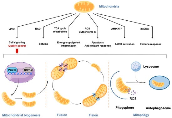 Additionally, TCA cycle metabolic products such as citrate, a-ketoglutarate, succinate, and fumarate commonly affect epigenetic modifications (nuclear DNA methylation, histone acetylation, and protein hydroxylation and acetylation) [,]. Since sirtuins (Sirt) are a direct product of mitochondrial complex I, alterations to NAD+ may have an impact on their activity [,,]. Sirt is a signaling molecule that regulates aging-related metabolic and non-metabolic processes [,,]. Additionally, by releasing mtDNA and peptides encoded by mtDNA (such as Humanin, HN, and the mitochondrial open reading frame of the twelve S rRNA-C, MOTS-c), mitochondria modulate the immunological response [,]. Mitochondrial collaboration with other cellular devices, such as the internal quality network, can regulate lipid homeostasis, immune response, and cell death []. Because maintaining cellular energy homeostasis requires a delicate balance, mitochondria must be better adapted to environmental changes in order to maintain continuous energy production and complete communication with other organelles for cell survival.