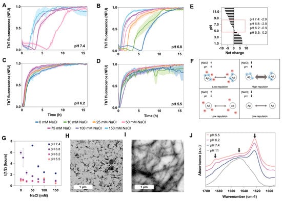 - Abelein, A.; Jarvet, J.; Barth, A.; Gräslund, A.; Danielsson, J. Ionic Strength Modulation of the Free Energy Landscape of Aβ40 Peptide Fibril Formation. J. Am. Chem. Soc. 2016, 138, 6893–6902. [Google Scholar] [CrossRef] [PubMed]