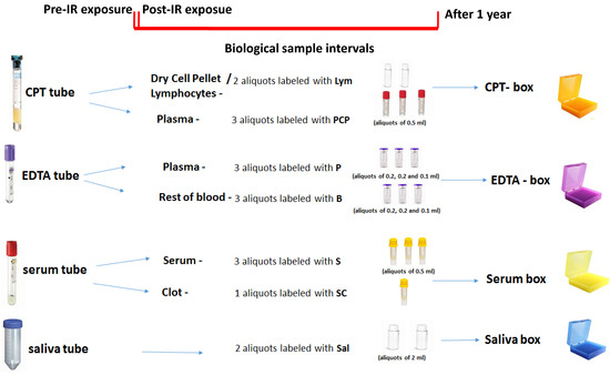 For radiotherapy patients, blood and saliva will be collected at three time points: before radiotherapy; three months after the last fraction (time point for the first follow-up); and one year after completion of the treatment. For X-ray-guided interventional catheterization procedures, biological samples will also be collected at three time points: before intervention; the same day after completion; and one year after completion. Figure 2 summarizes the protocol for the collection, preparation, and storage of biosamples.