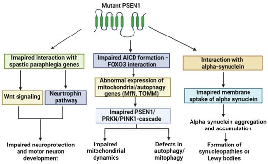 Studies on PSEN1 Leu166Pro and exon9 deletion revealed that PSEN1 may interact with alpha synuclein. This interaction may occur inside the different membrane compartments such as synaptic vesicles, Golgi apparatus or mitochondria. Mutant PSEN1 and alpha synuclein may prevent the release of the appropriate transport of alpha synuclein to phagosomes and autophagosomes. PSEN1 mutations may result in a stronger interaction between PSEN1 and alpha synuclein. This interaction may inhibit the release of alpha synuclein to proteosomes or autophagosomes, leading to the aggregation of alpha synuclein. Further studies are needed to determine how a mutant PSEN1–alpha synuclein interaction may impact the formation of Lewy bodies []. Taken together, PSEN1 may interact with several genes or proteins. The impairment of these gene interactions could result in motor impairment in cases of PSEN1 mutations. Figure 2 introduces the possible pathways through which PSEN1 could impact motor impairment diseases.