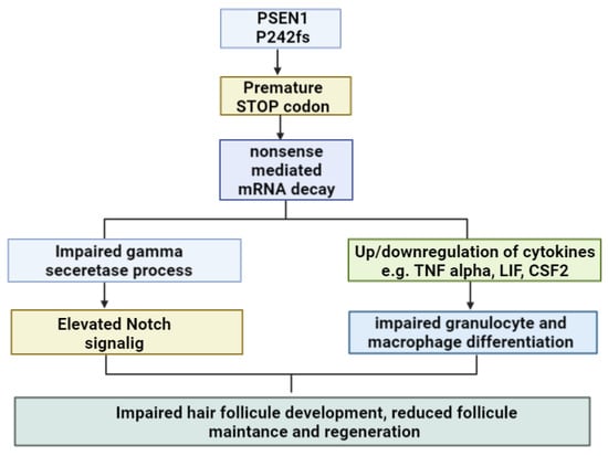 It was suggested that the mutation alters the inflammatory pathway and changes the cytokine/chemokine expression in PMA-differentiated macrophages. A truncated PSEN1 protein was related to a higher expression of pro-inflammatory TNF alpha, TNFSF11 or IL11. Additional chemokines, such as CCL17 and CX3CL1, were also upregulated in mutant macrophages []. Furthermore, Pro242fs mutation may reduce the expression of other inflammatory molecules, such as LIF, IL5 IL12B, CSF2 and BMP2. The overexpression of the Pro242fs mutation could induce inflammation and impair the immune cell homeostasis. The mutation could result in disturbances in the differentiation of granulocytes and macrophages, the maintenance of immune reaction or the regeneration of hair follicles [,] (See Figure 3).