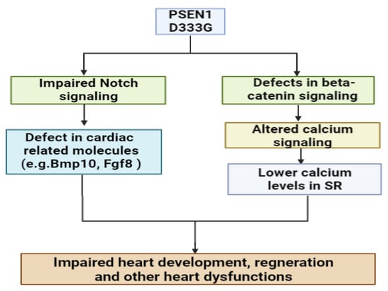 Dilated cardiomyopathy (DCM) was related to PSEN1 Asp333Gly mutation. The mutation was found in an African family in which one family member had AD, while the other six affected relatives were diagnosed with an aggressive heart disorder [,]. Both APP and PSEN genes were found to be expressed in the heart, suggesting that the role of APP-related gamma secretase activity in heart disease may not be ruled out. To date, no evidence has been found of the relationship between APP cleavage and heart dysfunction [,]. PSEN1 D333G was transfected into HEK293 cells but did not result in an alteration in the Ab42/Ab40 ratio. DCM may not be related to impaired APP cleavage by gamma secretase, suggesting that PSEN1 (and PSEN2) could impact heart failure through an amyloid-independent mechanism []. PSEN1 may play a crucial role in cardiac development. PSEN1 knockout mice presented several heart dysfunctions, such as ventricular septal defect (VSD) or double outlet right ventricle (DORV). PSEN1 deficiency could result in impairment in the development of cardiac neural crest cells and heart morphogenesis []. Possible mechanisms through which PSEN1 may be related to DCM include impaired Notch signaling [,,]. Notch signaling was confirmed to be involved in heart development; as an endocardial-derived signal, it can regulate the cell fate determination and heart tissue development and regeneration. Notch signaling could interact with several molecules, such as Tgfβ2, Bmp10, Fgf8 and Bmp4, for cardiac development and function. Dysfunctions in Notch signaling may result in heart dysfunctions in both children and adults [].