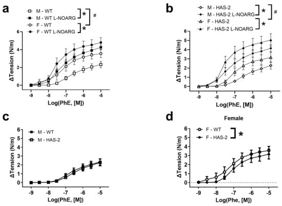 To examine the contractile responses in the aortas of mice, they were exposed to a depolarizing physiological saline solution with high K+ concentrations (KPSS), and a concentration–response curve was constructed for phenylephrine (PhE). The aortas of wild-type (WT) and HAS-2 mice contracted similarly in response to PhE and KPPS (Figure 1, Table 1, and Figure A1). However, the contractions in the aortas of female mice were increased compared to those of male mice (Figure 1). In the presence of an inhibitor of NO synthase, PhE contractions were markedly increased in the aortas of both WT and HAS-2 mice, and were similar between sexes.