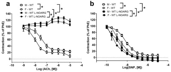 Sex-specific differences in acetylcholine and sodium nitroprusside relaxation in the aortas of wild-type (C57Bl6J) mice. Average concentration–response curves for (a) acetylcholine (ACh) and (b) sodium nitroprusside (SNP) in phenylephrine (PhE)-contracted aortas of male (M) and female (F) mice. The curves were obtained in the absence and the presence of an inhibitor of nitric oxide (NO) synthase (L-NOARG) (3 × 10−4 M). Results are presented as the means ± s.e. * p < 0.05 according to two-way ANOVA.