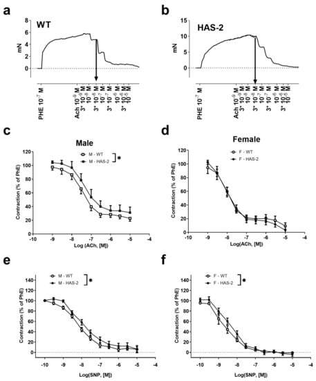 Blunted acetylcholine and sodium nitroprusside relaxation in the aortas of male mice overexpressing hyaluronan synthase 2 (HAS-2). (a,b) Traces representative of relaxation induced by increasing concentrations of acetylcholine (ACh) in the aortas of wild-type (WT) (a) and HAS-2 (b) male mice. (c,d) Averaged concentration–response curves for ACh in WT and HAS-2 male (c) (n = 11) and female (d) (n = 5) mice (n = 11). (e,f) Averaged concentration–response curves for sodium nitroprusside (SNP) in aorta segments from male (e) (n = 11) and female (f) (n = 5) mice. The results are presented as the means ± s.e. * p < 0.05 according to two-way ANOVA.