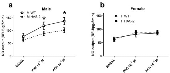 To investigate whether decreased NO levels underlie impaired endothelium-dependent relaxation, they were measured using a NO-sensitive fluorescent dye, DAF, at baseline and after the addition of 10−7 PhE, followed by 10−5 M ACh. The baseline NO levels were unchanged in the aortas of male and female HAS-2 versus WT mice (Figure 4a,b). We observed a decrease in fluorescence and, thus, the NO output from the HAS-2 male aortas compared to the WT male aortas after PhE and ACh stimulation (Figure 4a). We detected no differences between the aortas of WT and HAS-2 female mice (Figure 4b).
