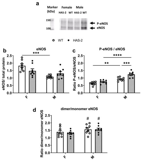 Expression of endothelial nitric oxide synthase (eNOS) and eNOS-Ser1177 phosphorylation (P-eNOS). (a) Representative immunoblot of P-eNOS, located at approximately 150 kDa, and eNOS, located at approximately 130-140 kDa, in aortas of wild-type (WT) and mice overexpressing hyaluronan synthase 2 (HAS-2). (b) Average eNOS expression in WT and HAS-2 female (F) and male (M) mice. (c) Average p-eNOS/eNOS ratio in HAS-2 mice and their WT littermates. (d) Average dimer/monomer eNOS ratio in HAS-2 and WT mice. ** p < 0.01, *** p < 0.001, and **** p < 0.0001 according to two-way ANOVA with Šídák’s multiple comparisons test. # p < 0.05 compared to female mice according to two-way ANOVA.