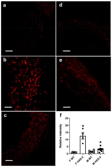 eNOS is not the only source of superoxide formation in the vascular wall. Therefore, we measured total superoxide using DHE, which is a cell-permeable dye that emits blue fluorescence. In the presence of O2-, DHE is oxidized to ethidium, which is impermeable to intact cell membranes and emits red fluorescence, and was detected in sections from both HAS-2 and WT animals; however, it did not occur in sections treated with polyethylene glycol-conjugated SOD (PEG-SOD) (Figure 6a–f). The relative fluorescence intensity was markedly increased in the aortas of HAS-2 animals of both sexes compared to WT animals (Figure 6f), but there were no differences in the aortas of male and female mice.