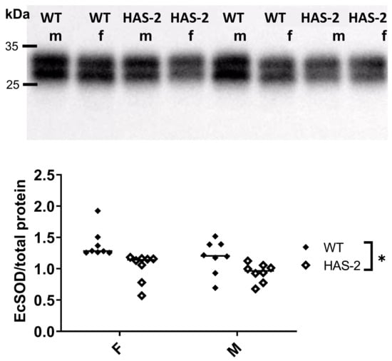 To gain further insight, we investigated the main scavenger of superoxide in the vasculature: ecSOD. We found a statistically significant decrease in ecSOD expression in the HAS-2 animals compared to the WT animals (Figure 7). There were no sex-dependent differences. The downregulation of ecSOD and increase in superoxide may have contributed to the reduced bioavailability of NO and blunted ACh relaxations in the aortas of male HAS-2 mice. The lack of change in response in the aortas of female HAS-2 mice could be ascribed to the requirement for less NO to induce relaxations of similar magnitude in the aortas of female mice, as evidenced by their higher sensitivity to SNP.