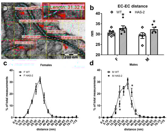 Endothelial cell–cell distance increases in HAS-2 mice. (a) Electron micrograph image showing how distance measurements were made. The blue dotted line indicates the border between endothelial cells (ECs). Red arrowheads indicate some of the spots where distance was measured. The red square is a magnification of one of those spots. (b) Average distance between ECs from wild-type mice (WT) and transgenic mice overexpressing hyaluronan synthase 2 (HAS-2). Each point represents the mean of ~329 measurements. * p < 0.05 according to two-way ANOVA. Graphs depict the distribution of measurements in the WT vs. HAS-2 females (c) and males (d). * p < 0.05 at the indicated distances compared WT.