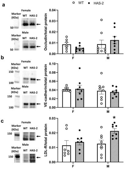 Male mice overexpressing hyaluronan synthase 2 (HAS-2) showed increased expression of the low-density lipoprotein receptor (LDL-R). Representative immunoblots (left) and average protein expression of (a) occludin, (b) vascular endothelial cadherin (VE cadherin), and (c) LDL-R. Immunoblotting for occludin in the aortas of male (M) and female (F) wild-type transgenic mice and mice overexpressing HAS-2. Arrows indicate the quantified band, which in the case of LDL-R, is based on the band for the positive control. The data are presented as the means ± s.e. * p < 0.05 versus WT mice according to two-way ANOVA with Šídák’s multiple comparisons tests.
