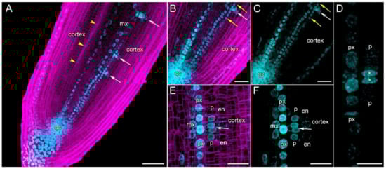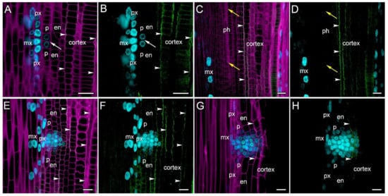 - Torres-Martínez, H.H.; Hernández-Herrera, P.; Corkidi, G.; Dubrovsky, J.G. From one cell to many: Morphogenetic field of lateral root founder cells in Arabidopsis thaliana is built by gradual recruitment. Proc. Natl. Acad. Sci. USA 2020, 117, 20943–20949. [Google Scholar] [CrossRef] [PubMed]