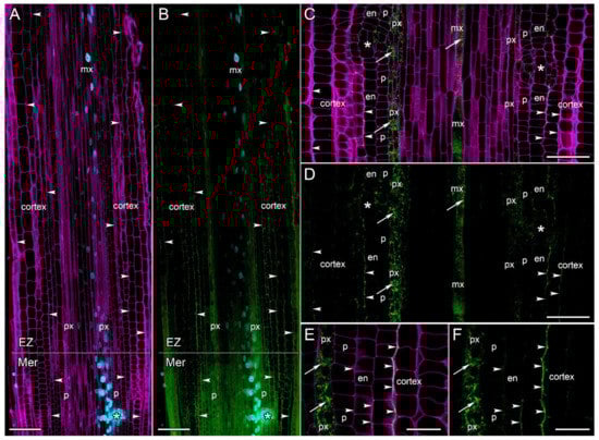 - Xuan, W.; Audenaert, D.; Parizot, B.; Möller, B.K.; Njo, M.F.; De Rybel, B.; De Rop, G.; Van Isterdael, G.; Mähönen, A.P.; Vanneste, S.; et al. Root cap-derived auxin pre-patterns the longitudinal axis of the Arabidopsis root. Curr. Biol. 2015, 25, 1381–1388. [Google Scholar] [CrossRef]