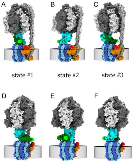 Models of FRET-labeled FoF1-ATP synthase in the three rotary states of the γ- and ε-subunits with respect to the F1 subunits α3β3δ (white and dark gray) and Fo subunits b2 (light gray, peripheral stalk). (A–C) cryoEM structures in the presence of 10 mM ADP with subunits b2 oriented to the right side []. (D–F) cryoEM structures in the presence of 10 mM ATP with subunits b2 oriented to the back side []. Green spheres are positions of the S atom of cysteine εH56C on the ε-subunit (dark green) labeled with FRET donor Cy3B, red spheres are modeled positions of the S atom of cysteine a276C on the a-subunit (orange) labeled with FRET acceptor Alexa Fluor 647. The central rotary γ-subunit of the F1 domain is shown in cyan, and c-subunits of the Fo domain in dark blue and in light blue, embedded in the membrane (indicated by the gray disc). During ATP hydrolysis, the rotary states move sequentially in the order …→state #1 (D)→state #2 (E)→state #3 (F)→… for the counter-clockwise rotation direction when viewed from the bottom.