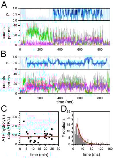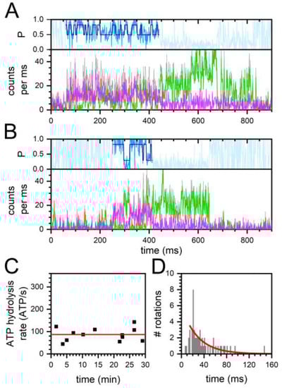 Figure 2 shows examples of FoF1-ATP synthases in the presence of 30 μM ADP and 70 μM ATP. Both FRET-labeled active enzymes exhibited very distinct ATP turnover. The FoF1-ATP synthase in Figure 2A was trapped at a laboratory time of about 330 ms as characterized by a sudden increase of the photon counts in the donor (green) and the acceptor (magenta) channel. This enzyme was trapped for 495 ms. The sum of both donor and acceptor photon counts is shown as the gray intensity trace. The proximity factor P trace (light blue, upper panel) fluctuated between two FRET states according to the Hidden-Markov Model (HMM) assignment by the DISC software []. For details, see Section 4 below. The number of fluctuations of the proximity factor was analyzed by assuming that a full 360° rotation of the ε-subunit was characterized by a pair of two distinct FRET states (i.e., one high plus one low FRET state, or vice versa). Each FRET state pair corresponded to three hydrolyzed ATP molecules. Thus, the enzyme in Figure 2A with 26 FRET-state pairs hydrolyzed 78 ATP molecules in 495 ms, i.e., with a mean ATP hydrolysis rate of 168 ATP/s.