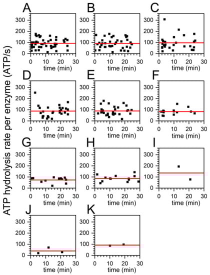 This nucleotide mixture contained a much larger fraction of the catalytic product ADP. However, the smaller amount of ATP was still high enough that a significant substrate consumption over the time course of 30-min recordings was not observed, and slow and fast rotating enzymes were detected with similar probabilities at the beginning and the end of the measurements (Figure 3C). The average ATP hydrolysis rate calculated from the mean of each individual enzyme was 86 ATP/s (red line in Figure 3C).