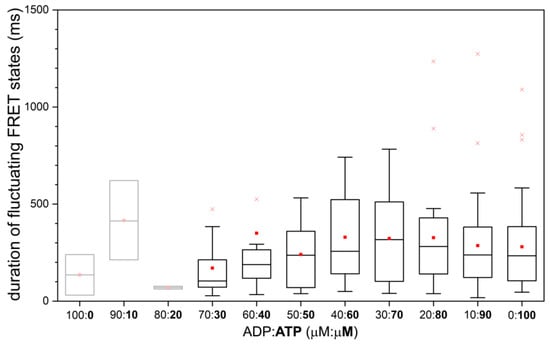 Durations of the individual fluctuating FRET state periods within the photon bursts of FRET-labeled FoF1-ATP synthases in the presence of 11 different ADP/ATP ratios. Data for the 100/0, the 90/10, and the 80/20 ADP/ATP ratios were based on less than 5 enzymes and were shaded. Red crosses were outliers, red squares represented the arithmetic mean of the fluctuating FRET state periods.