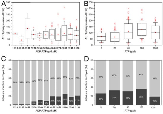 (A,B) Box plots of mean individual turnover of individual FRET-labeled FoF1-ATP synthases, (A) in the presence of 11 different ADP/ATP ratios and (B) in the presence of ATP only at five different concentrations (in μm). Red crosses were outliers, red squares were the arithmetic means. (C,D) Percentage of active (dark gray fraction) and inactive enzymes (light gray fraction), (C) in the presence of different ADP/ATP ratios, and (D) in the presence of ATP only. The data for the ATP-only figures (B,D) were obtained by re-analyzing our previous smFRET measurements [], and by applying FRET state assignments with the DISC HMM software described in Section 4.