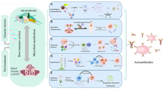 Mechanisms of autoimmunity triggered by microorganisms. Host-microbe interaction can be influenced by environmental and genetic factors, causing abnormal immune regulation, and affecting the local or systemic autoimmune regulation. (A) Autoantigens Overproduction: MMPs secreted directly by bacteria or by immune cells stimulated by bacteria can degrade the extracellular matrix to produce “remnant epitopes” acting as autoantigens. Or the protein fragments produced by MMPs can be modified (such as citrullination) to form antigen epitopes; (B) Microbial Translocation: bacteria and their products can migrate to other organs using some substitute for dissemination mechanisms(such as intracellular bacteria living), resulting in abnormal contact with the host immune system, local inflammatory responses, and the production of autoantibodies; (C) Molecular Mimicry: molecular mimicry occurs when self-antigen has the similar epitopes in composition or structure with microbial epitopes. When the immune system attacks microorganisms, it accidentally injures host cells due to the similarity of antigens; (D) Superantigens: superantigens such as staphylococcus aureus enterotoxin b (SEB) interact with the Vβ variable region of the T cell receptor (TCR), leading to the expansion of T cell. This less specific recognition can mediate a powerful inflammatory response and induce normal resting autoreactive T and B cells activate to induce the autoimmune response; (E) Inhibition Receptors Related to Autoimmunity: inhibitory receptors regulate autoimmunity by inhibiting the immune response and limiting TCR signaling. Nasal mucosa T cells are not controlled after inhibitory receptors (PD-L1, PD-L2) are reduced, producing IL-21 to promote B cell activation and excessive IgM, IgA, and IgE production, as well as granulocyte inflammation. (Figdraw was used to create the Figure 1).