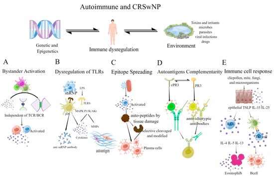 The mechanism of autoimmunity depends on the host response, resulting in the loss of immunological tolerance to self-antigens. (A) Bystander activation: this activation is independent of TCR and BCR. The inflammatory microenvironment activates bystander immune cells, perpetuating the inflammatory environment and forming a vicious cycle; (B) Dysregulation of TLRs: snRNPs can stimulate TLRs, activate innate immune cells, such as plasmacytoid dendritic cells (pDCs), and promote the production of anti-SnRNPs autoantibodies []. TLRs can affect local inflammation, and promote the production of MMPs through MAPK and PI3K/Akt signaling pathway, leading to the emergence of autoantigen epitopes; (C) Epitope Spreading: inflammation, tissue damage, and the release of autopeptides can activate T cells to recognize epitopes and activate B cell complementarity, causing epitope spreading. The selective cleavage or epitope modification by proteases in APCs also contributes to epitope spreading; (D) Autoantigens Complementarity: the autoantigen has a complementary amino acid sequence to the initial antigen sequence. The initial protein initiates the production of antibodies and causes an anti-antibody response (the anti-idiotypic response), resulting in anti-idiotypic antibodies reacting with the autoantigen; (E) Immune cell response: mites, fungi, microorganisms, etc., induce epithelial cells to secrete cytokines that activate innate lymphoid type-2 cells (ILC2) and TH2 cells, causing local eosinophilia inflammation and B cell activation. (Figdraw was used to create the Figure 2).