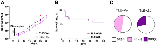 Effects of B. longum treatment on body weight dynamics, survival rate, and spontaneous recurrent seizures (SRSs) of TLE rats. (A) Body weight dynamics of TLE rats with B. longum treatment (BL) and without treatment (Veh). * p < 0.05 post hoc Sidak comparison test. Data are expressed as mean and standard error of the mean. (B) Survival of animals during the 30-day course of administration of probiotic. (C) Percentage of rats with SRSs in groups of treated (TLE + BL) and untreated (TLE + Veh) animals.