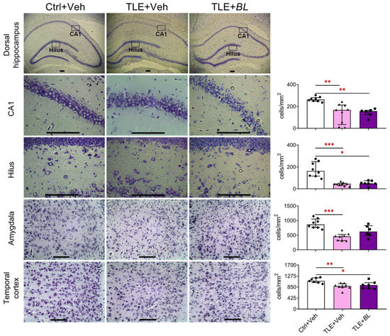 Effects of 30 days of B. longum (BL) administration on neuronal density in the dorsal hippocampus, temporal cortex, and amygdala. Scale bar = 150 µm. Ctrl—control rats; TLE + Veh—untreated TLE rats; TLE + BL—B. longum-treated TLE rats. Kruskal–Wallis H test followed by Dunn’s multiple comparison test: * p < 0.05; ** p < 0.01, *** p < 0.001. Data are presented as median and interquartile range. Each data point corresponds to a single animal.