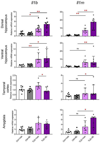 The Kruskal–Wallis test showed that Il1rn mRNA expression was altered in the TLE groups in all brain regions examined: dorsal hippocampus (H = 23.4; p < 0.001), ventral hippocampus (H = 15.2; p < 0.01), temporal cortex (H = 12.7; p < 0.01), and amygdala (H = 12.5; p < 0.05). However, post hoc tests revealed a significant increase in the TLE + Veh group compared to the Ctrl + Veh group, only in the dorsal hippocampus, whereas in the probiotic-treated animals, a significant increase in expression (Ctrl + BL vs. TLE + BL) was observed in all brain structures examined. Thus, the results suggest the ability of probiotics to somewhat limit neuroinflammatory and enhance anti-inflammatory processes in the TLE.