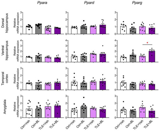 The effects of a 30-day course of B. longum (BL) or water (Veh) administration on the relative expression of Ppars genes in rat brain structures of control (Ctrl) and epileptic (TLE) rats. Two-way ANOVA followed by post hoc Sidak test: * p < 0.05. Data are presented as means and standard errors of the mean. Each data point represents the result of a single animal. The full result of the statistical processing can be found in Appendix B (Table A1).