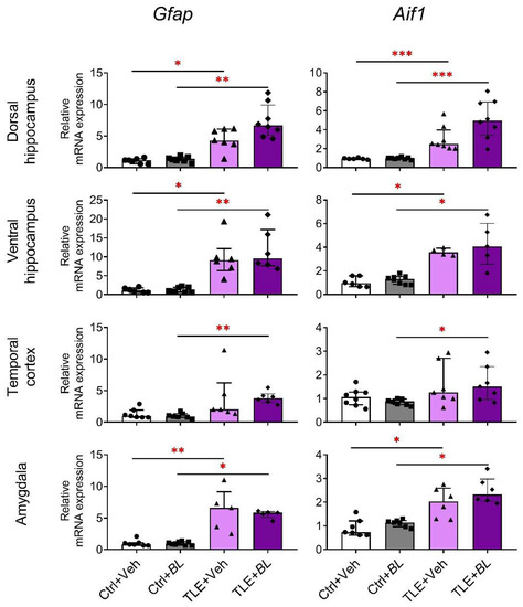 Our results show that Gfap and Aif1 mRNA expressions increase in all brain structures of TLE rats (Figure 5). However, the comparison of Ctrl + Veh and TLE + Veh groups showed no significant difference in the temporal cortex. Probiotic treatment not only failed to block this effect, but also caused Gfap and Aif1 to be more upregulated. Therefore, the increased expression of these genes was observed in all brain regions examined in the TLE + BL group compared to the Ctrl + BL group, including the temporal cortex.