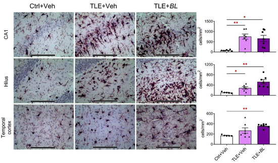 The effects of a 30-day course of B. longum (BL) or water (Veh) administration on the density of microglia (immunohistochemical staining for IBA1) in the CA1, hilus, and temporal cortex. Micrographs were taken from animals with values near the median. Scale bar = 150 µm. Ctrl + Veh—control rats; TLE + Veh—untreated TLE rats; TLE + BL—probiotic-treated TLE rats. Welch’s ANOVA: CA1: F2,8.1 = 20.2; p = 0.001; hilus: F2,7.8 = 17.1; p = 0.001; temporal cortex: F2,9.1 = 70.2; p < 0.001. Games–Howell post hoc test: * p < 0.05, ** p < 0.01. Data are presented as means and standard errors of the mean. Each data point represents the result of a single animal.