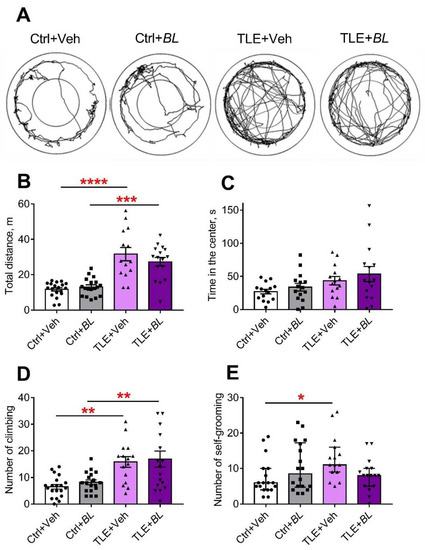 The effects of a 30-day course of B. longum (BL) or water (Veh) administration on the behavior of control (Ctrl) and TLE rats in the OFT. (A) Track samples; (B) total distance; (C) time in the center; (D) number of climbs. Two-way ANOVA followed by post hoc Sidak test: ** p < 0.01, *** p < 0.001, **** p < 0.0001. Data are presented as means and standard errors of the mean. (E) Number of self-grooming episodes. Kruskal–Wallis H test followed by Dunn’s multiple comparison tests. Data are presented as median and interquartile range. * p < 0.05. Each data point represents the result of a single animal.