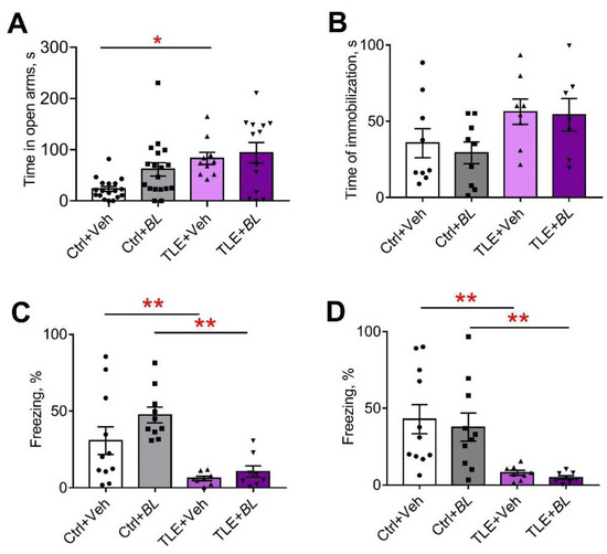 The effects of a 30-day course of B. longum (BL) or water (Veh) administration on the behavior of control (Ctrl) and TLE rats in the elevated plus maze (EPM), forced swim test (FST), and fear conditioning test (FCT): (A) time in the open arms of the EPM; (B) time of immobilization in the FST; (C) time of freezing in the familiar cage in the FCT; (D) time of freezing in a novel cage during tone presentation. Two-way ANOVA followed by post hoc Sidak test: * p < 0.05, ** p < 0.01. Data are presented as means and standard errors of the mean. Each data point represents the result of a single animal.