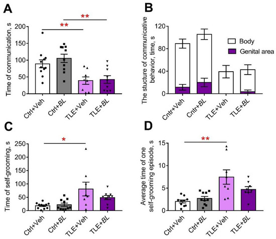The effects of a 30-day course of B. longum (BL) or water (Veh) administration on the behavior of control (Ctrl) and TLE rats in the social interaction test (SIT): (A) time of communication; (B) structure of communicative behavior; (C) total time of self-grooming; (D) average time of a self-grooming episode. Two-way ANOVA followed by post hoc Sidak test: * p < 0.05, ** p < 0.01. Data are presented as means and standard errors of the mean. Each data point represents the result of a single animal.