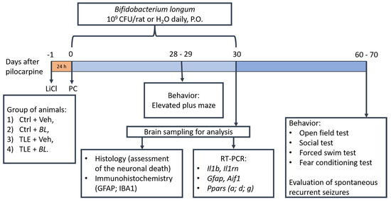 The aim of this work is to investigate the neuroprotective, anti-inflammatory, and behavioral effects of a 30-day treatment with the probiotic B. longum in a lithium-pilocarpine model of TLE. The choice of B. longum as the object of study, among other probiotics used in mixtures, was based on the fact that it is a psychobiotic, i.e., a probiotic with a pronounced effect on the central nervous system. Its effects on stress-related behavior, physiology, and cognitive abilities have been previously demonstrated [48].
