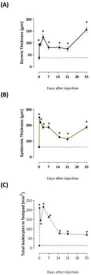 In Figure 1B, histological examination of H&E-stained paraffin foot pad sections from the control-group of mice reveals normal cell architecture with a baseline number of infiltrating cells. On the contrary, the VTn-injected group exhibited paw necrosis identified by the disruption of tissue architecture with ghost cells (green asterisk and green arrow) and fewer discernible nuclei, mainly at 4 h, 1 d, 15 d, and 21 d compared to the control-group of mice. Also, the formation of new dermis and epidermis under the necrotic tissue until 35 d was visible. Dermal thickening was evident immediately after 4 h of injection and at 1 d, with an increase at 3 d. Between 7 and 21 days, the thickening decreased but remained high at 35 d after the injection (Figure 2A). The peak of the epidermal thickness was seen after 4 h of the injection, successively declined until 21 d, and increased again at 35 d of the injection (Figure 2B) showing dermis and epidermis swelling.