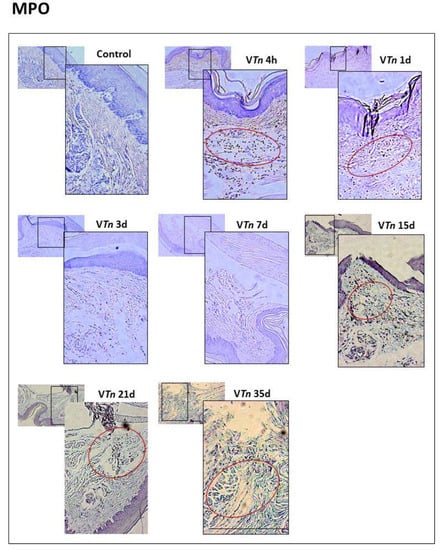 When the analysis was performed on the paws of mice injected with VTn, a large accumulation of MPO-positive neutrophils in the epidermis was evident mainly in the hemostasis and inflammatory phases of the lesion, which remained high during the remodeling phase (Figure 3). We quantified a large influx of neutrophils (137 ± 13) at 4 h, which decreased at 24 h (95 ± 13), at 3 d (18 ± 1), and at 7 d (24 ± 1). However, neutrophilia reappears in the lesion at the proliferative phase, 15 d (66 ± 8) and 21 d (62 ± 6), and remains at moderate levels for up to 35 days (63 ± 7) (Figure 4).
