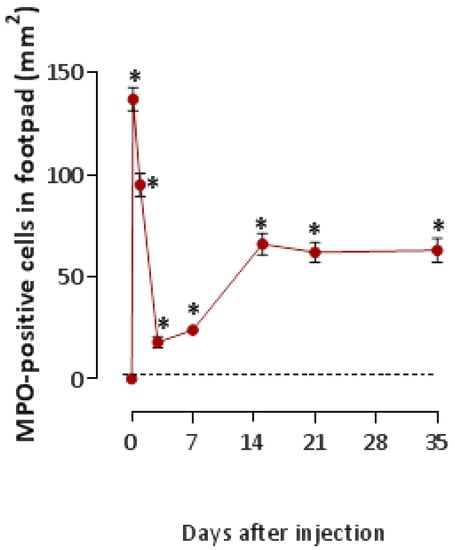 Quantitative analysis of MPO-positive neutrophils. The paws of the mice from the control-group and the VTn injected group collected after 4 and 24 h, 3, 7, 15, 21, and 35 days after injection were fixed, paraffinized, and sectioned at 5 μm for subsequent staining with the anti-MPO antibodies. MPO-positive neutrophils were counted by manual scoring on a 400 mm2 section per slide using Axio Vision Rel 4.8 software * p < 0.05 compared to the control-group at 0 h.