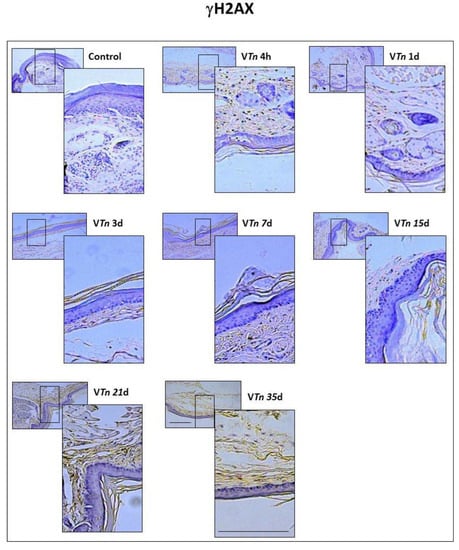Histological examination (Figure 5) and parallel quantification (Figure 6A) show that sections of the paws from control mice stained with anti-γH2AX have a scarce number of positive foci. We found that γH2AX-positive foci were significantly increased in VTn wounds at 4 h (106 ± 15 compared with 22 ± 1.1 of the control-group at 0 h) which progressively increased to 35 d (385 ± 19.36) randomly distributed across all cell types in the wound.
