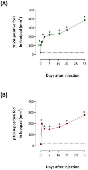 Quantitative analysis of senescence. The paws of the mice from the control-group and the VTn injected group collected after 4 and 24 h, 3, 7, 15, 21, and 35 days after injection were fixed, paraffinized, and sectioned at 5 μm. Foci of immunoperoxidase staining for γH2AX (A) or p16INK4a (B) in either the nucleus or cytoplasm were counted in tissue by manual scoring on a 400 mm2 section per slide and performed using Axio Vision Rel 4.8 software * p < 0.05 compared to the control-group at 0 h.