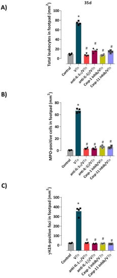 Quantitative analysis of senescence and neutrophilia mediated by IL-1α, IL-1β, and caspases-1 and -11. Mice were treated 30 min before VTn injection with anti-IL-1α and anti-IL-β neutralizing antibodies, or caspase-1 (Ac YVAD-CMK) and caspase-11 inhibitors (Wedelolactone). The control-group received an equivalent volume of PBS. After 35 d, all groups of mice had paws amputated, fixed, paraffinized, and sectioned at 5 µm. The number of total leukocytes recruited to the paws was counted on slides stained with H & E (A), the number of neutrophils was counted on slides stained with the anti-MPO antibody (B), and senescence foci were counted on slides stained with the anti-γH2AX antibody (C) * p < 0.05 compared with the control-group at 0 h and # p < 0.05 compared with VTn-group.