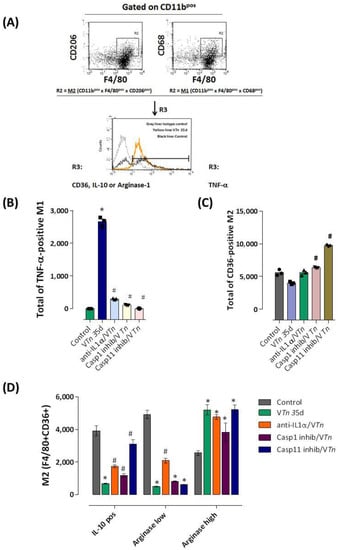 The frequency of M1 macrophages staining positive for TNF-α, or M2 staining positive for CD36 (a receptor that binds and phagocytoses apoptotic cells and other oxidized lipids), IL-10, or Arginase-1 involved in the wound healing process [] were investigated as demonstrated in the R3 in the control-group, VTn 35d, anti-IL1a/VTn, casp-1 inhibitor /VTn, and casp-11 inhibitor/VTn.