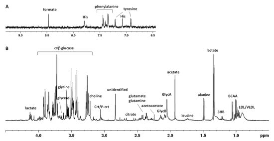 Typical 600 MHz 1H CPMG (Carr–Purcell–Meiboom–Gill) NMR spectrum of human serum in the aromatic (A) and aliphatic (B) regions. Abbreviations used: BCCA—branched chain amino acids (valine, isoleucine, leucine); 3HB—3-hydroxybutyrate; His—histidine; LDL/VLDL—low-/very-low-density lipoprotein; GlycA/GlycB—N-acetyl glycoprotein; Crt/P-crt—creatine/phosphocreatine.