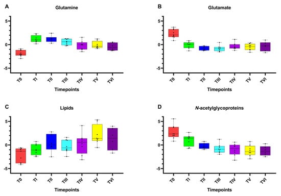 Box and whisker plots of the significantly altered metabolites (spectral bins) according to NMR data analysis. Y axes are represented as relative units. Data were mean-centered and normalized to the total spectral area. Due to the mean-centering and normalization process, we obtained a negative scale in the Y-axis of the bins (Metaboanalyst program analysis). The bar plots show the normalized values (mean +/− standard deviation). The boxes range from the 25% and the 75% percentiles; the 5% and 95% percentiles are indicated as error bars; single data points are indicated by black dots. The variations between the timepoints considered of (A) glutamine, (B) glutamate, (C) lipids, and (D) N-acetylglycoproteins are shown.