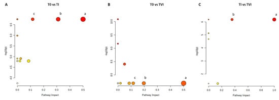 Metabolic pathways. Color intensity (white to red) reflects increasing statistical significance, and circle diameter varies with the pathway impact. The graph was obtained by plotting on the y-axis the −log10 transforms of p-values from the pathway enrichment analysis and on the x-axis the pathway impact values derived from the pathway topology analysis. The most significant pathways (p-value < 0.05; pathway impact > 0.1) are depicted (A) (a) D-glutamine and D-glutamate metabolism; (b) alanine, aspartate, and glutamate metabolism; (c) arginine biosynthesis. (B) (a) D-glutamine and D-glutamate metabolism; (b) alanine, aspartate, and glutamate metabolism; (c) arginine biosynthesis. (C): (a) phenylalanine, tyrosine, and tryptophan biosynthesis; (b) phenylalanine metabolism.