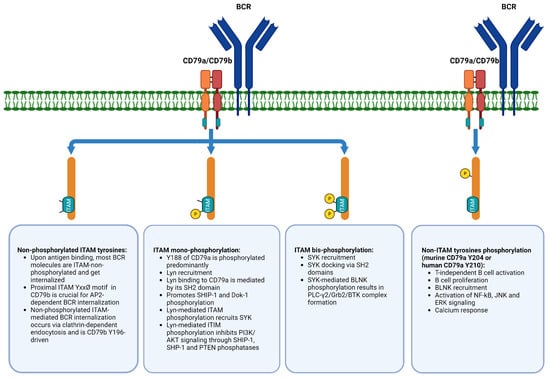 Intracellular domains of CD79a and CD79b have an immunoreceptor tyrosine-based activation motif (ITAM) made up of 26 amino acid residues and containing two critical tyrosine residues. ITAM tyrosines can undergo phosphorylation by the Src-family of kinases and are directly involved in BCR signal mediation [17,76,77]. Furthermore, it seems that ITAM phosphorylation also contributes to the regulation of BCR internalization [78].