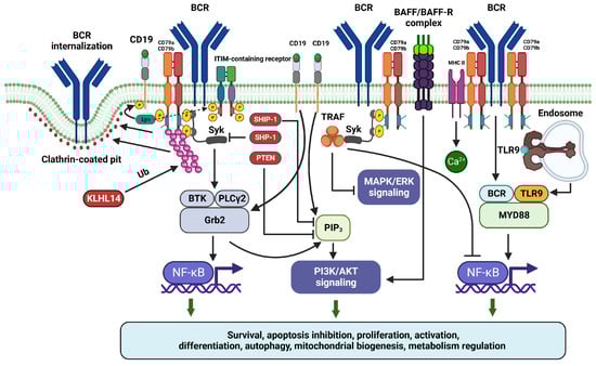 The role of CD79a/CD79b in B-cell receptor signaling in normal B cells. Abbreviations: BAFF—B-cell activating factor; BAFFR—B-cell activating factor receptor; BCR—B-cell receptor; BTK—Bruton’s tyrosine kinase; ERK—extracellular signal-regulated kinase; Grb2—growth factor receptor-bound protein 2; ITAM—immunoreceptor tyrosine-based activation motif; ITIM—immunoreceptor tyrosine-based inhibitory motif; KLHL14—Kelch Like Family Member 14; Lyn—Lck/Yes novel tyrosine kinase; MAPK—mitogen-activated protein kinase; MHC II—major histocompatibility complex class II; NF-κB—nuclear factor kappa-light-chain-enhancer of activated B cells; P—phosphate group; PI3K—phosphoinositide 3-kinase; PIP3—phosphatidylinositol (3,4,5)-trisphosphate; PLCγ2—phosphoinositide phospholipase C-γ-2; PTEN—phosphatase and tensin homolog; SHIP-1—Src homology region 2 domain-containing inositol 5′ phosphatase 1; SHP-1—Src homology region 2 domain-containing tyrosine phosphatase; Syk—spleen-associated tyrosine kinase; TLR9—toll-like receptor 9; TRAF3—tumor necrosis factor receptor (TNFR)-associated factor 3; Ub—ubiquitination. This figure was created with biorender.com.