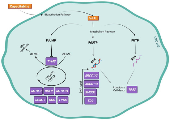 Single-nucleotide polymorphisms (SNPs) in genes encoding proteins involved in the pharmacodynamics (PD) pathway of capecitabine have the potential to influence treatment outcomes and drug survival [7]. As a prodrug, capecitabine undergoes enzymatic bioactivation to its active form 5-FU. The active drug is subsequently metabolized into three pharmacologically active metabolites: fluorodeoxyuridine monophosphate (FdUMP), fluorouridine triphosphate (FUTP), and fluorodeoxyuridine triphosphate (FdUTP). FdUMP acts as an inhibitor of thymidylate synthase (TS), an enzyme encoded by the thymidylate synthase gene (TYMS), which plays a crucial role in pyrimidine and DNA synthesis. Consequently, this inhibition disrupts the conversion of 5,10-methylenetetrahydrofolate (5,10-MTHF) to dihydrofolate, a vital component of the folate cycle. Furthermore, the metabolites FUTP and FdUTP directly incorporate into RNA and DNA, respectively, leading to direct genetic damage and subsequent cell death. Therefore, apart from TYMS, the genes involved in the folate cycle and DNA repair pathways play an important role in the PD of capecitabine (Figure 1) [8]. Indeed, numerous studies have investigated the impact of several SNPs in genes related to capecitabine’s PD, such as TYMS, enolase superfamily member 1 gene (ENOSF1), methylenetetrahydrofolate reductase gene (MTHFR), ERCC excision repair 1, endonuclease non-catalytic subunit gene (ERCC1), ERCC excision repair 2, TFIIH core complex helicase subunit gene (ERCC2), X-ray repair cross-complementing 1 gene (XRCC1), and X-ray repair cross-complementing 3 gene (XRCC3) on the effectiveness of FP therapy in gastrointestinal neoplasms [9,10,11,12,13,14,15,16,17,18]. However, the available evidence remains limited and characterized by conflicting findings, necessitating further investigation and exploration.
