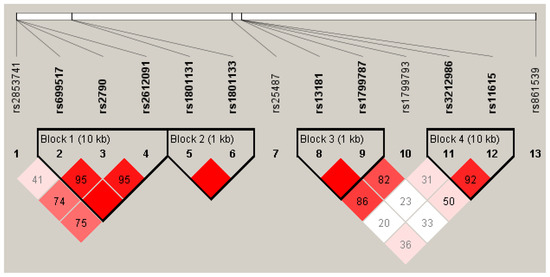 Linkage disequilibrium of selected SNPs. Color scheme: bright red: D’ = 1, LOD ≥ 2, shades of pink/red: D’ < 1, LOD ≥ 2; white: D’ < 1, LOD < 2.