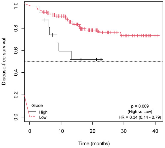 Kaplan–Meier curves for the association of DFS with histological grade.