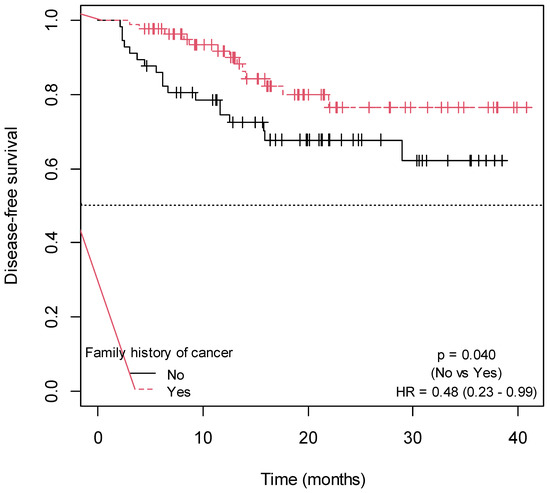Patients with low histological tumor grade (p = 0.009; HR = 0.34; 95% CI = 0.14–0.79; Figure 3) and a positive family history of cancer (p = 0.040; HR = 0.48; 95% CI = 0.23–0.99; Figure 4) exhibited a significantly higher DFS (Table S9). There was a trend towards increased DFS in patients with primary tumor located in the rectum (p = 0.080; HR = 0.50; 95% CI = 0.23–1.10) (Figure S1; Table S9). In contrast, a trend of association between larger tumor size and shorter DFS was observed (p = 0.080; HR = 1.14; 95% CI = 0.97–1.32) (Table S9). No association was found between DFS, and the rest of the sociodemographic and clinical variables collected in the study (Figures S2–S5; Table S9).